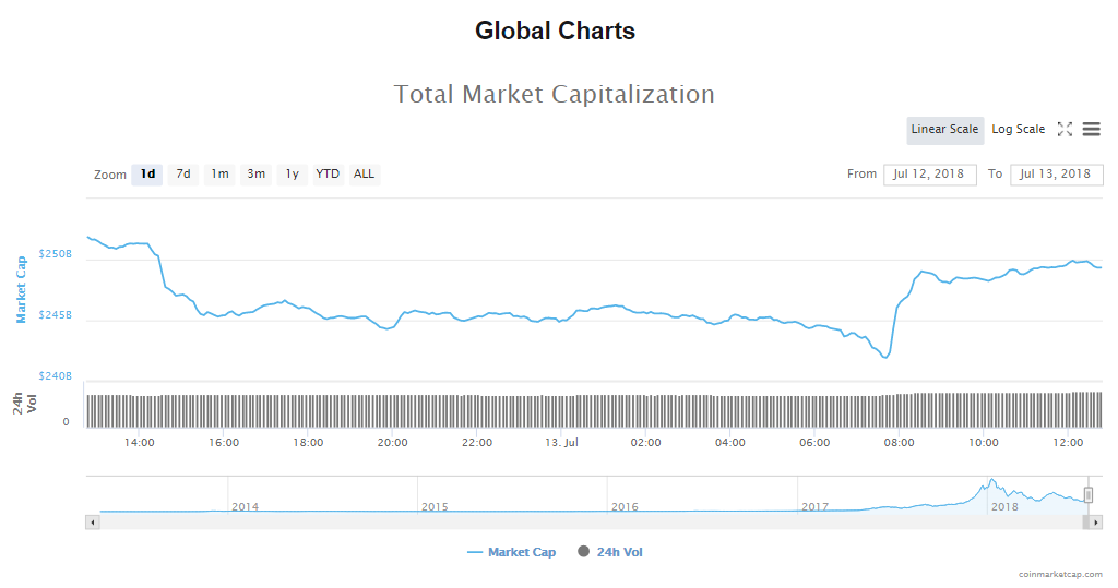 The trading volume in the cryptocurrency market inched up to $12.45 billion and the value of the market is current $249.75 billion, up a little over $4 billion from 24 hours ago.