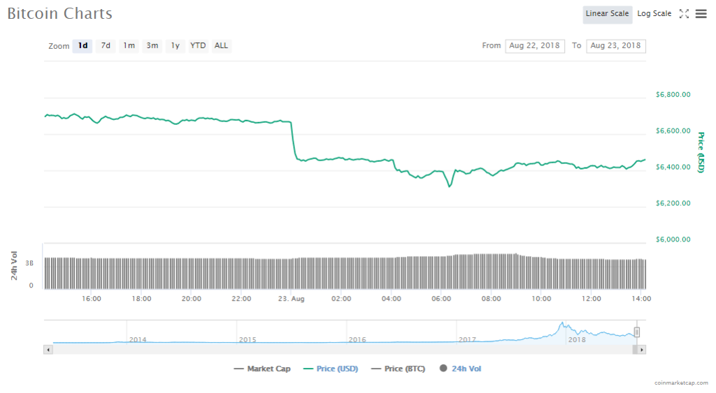 Bitcoin’s dropped by 3.77% since yesterday to trade at $6459.54. The market valuation of the token is $111.11 and its trading volume is $3.98 billion.