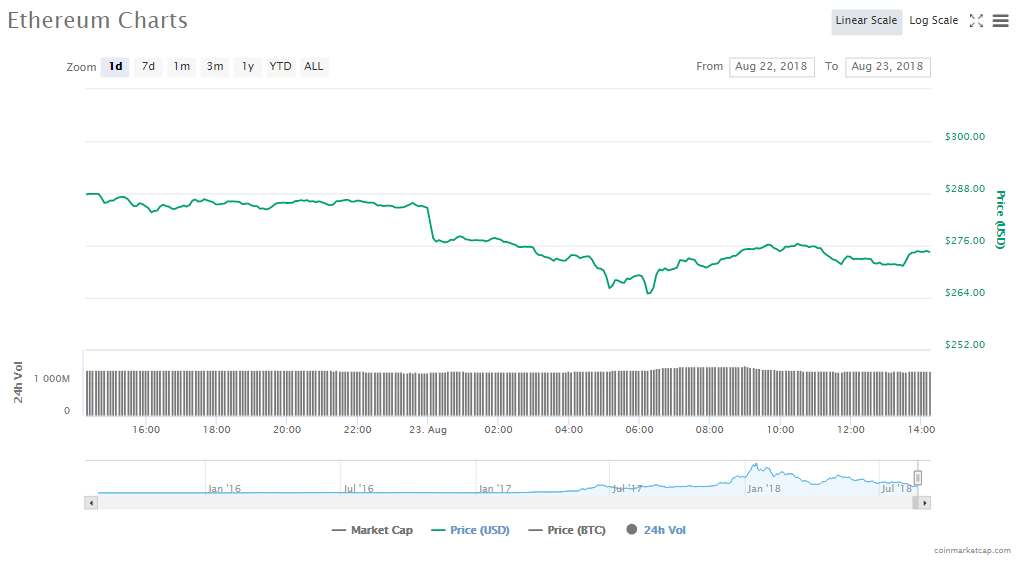 Ethereum’s price fell 6.21% to its current price of $274.56. The coin’s trading volume is at $1.37 billion and its market value has dropped to $27.83 billion.