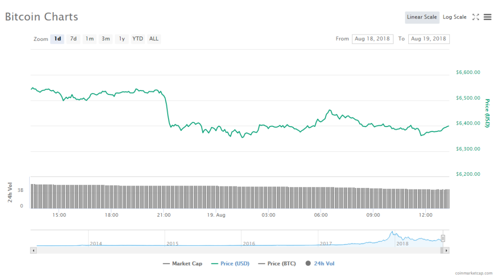 In the past 24 hours, Bitcoin fell 2.26% to trade at $6,397.17. The leading cryptocurrency’s trade volume trickled to $3.67billion, while its market slid to $110.15 billion.