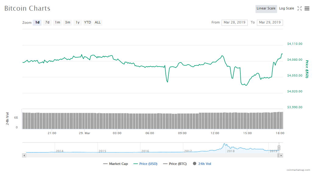The price of Bitcoin is $4096.40, a gain of 0.49% since yesterday. The capitalization of BTC is at $72.16 billion and trading volumes are $10.37 billion.