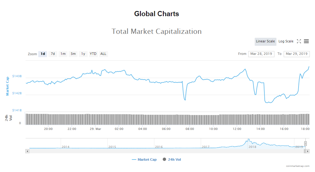 The capitalization of the cryptocurrency market is $143.61 billion and trading volumes for cryptocurrencies across all markets are at $34.71 billion.