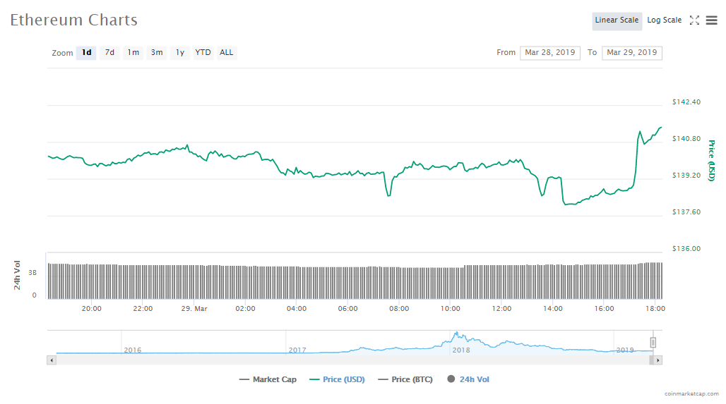 Ethereum’s market price is now $141.23, which is a 0.87% increase since yesterday. The altcoin’s capitalization in the market is now $14.89 billion and its trading volumes are at $4.80 billion.