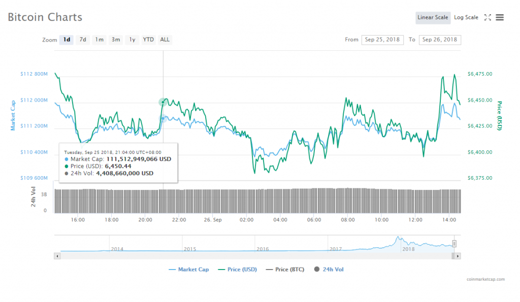 In the past 24 hours, Bitcoin fell 0.22% to trade at $6,448.13. The leading cryptocurrency’s trade volume trickled to $4.38 billion, while its market slid to $111.48 billion.