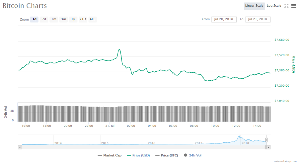 Since yesterday, Bitcoin slipped back 1.14% to trade at $7345.52. Bitcoin’s trading volume is at $4.80 billion and its valuation in the crypto market is $126.13 billion.