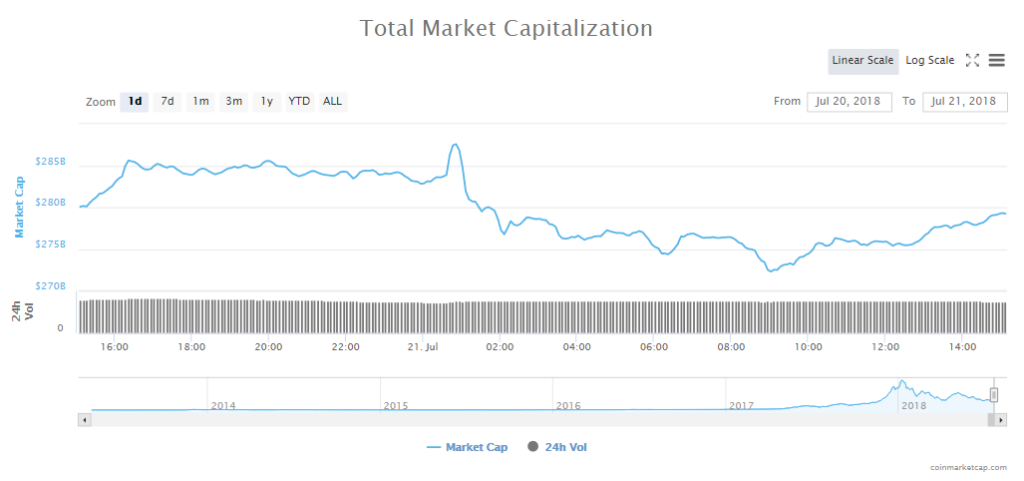 Trading volume slipped for the third day in a row to $14.69 billion and the cryptocurrency market’s capitalization is now $279 billion.