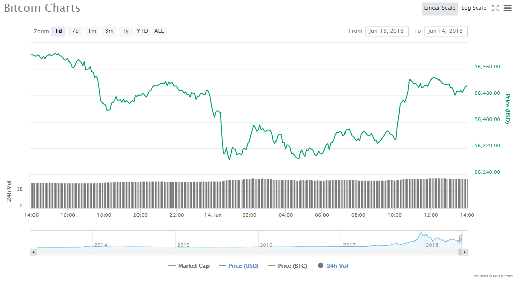 • Bitcoin dropped 1.38% to a trading price of $6509.87. The virtual asset’s market value is $111.20 billion.