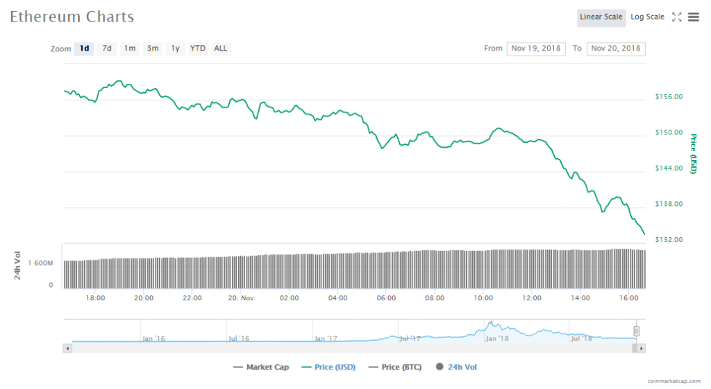 Ethereum has dropped by another 16.01% since yesterday to a price of $133.51 and its capitalization is now $13.79 billion. Trading volumes are high at $2.75 billion.