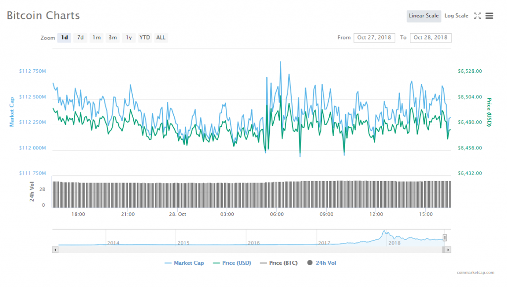 In the past 24 hours, Bitcoin fell 0.40% to trade at $6,462.49. The leading cryptocurrency’s trade volume trickled to $3.39 billion, while its market slid to $112.09 billion.