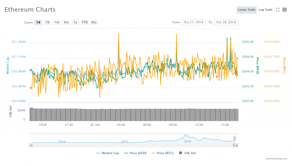 Ethereum’s price fell 0.18% to trade at $203.59. As for the altcoin’s trading volume, it reached $1.08 billion; whereas its market capitalization hit $20.94 billion.