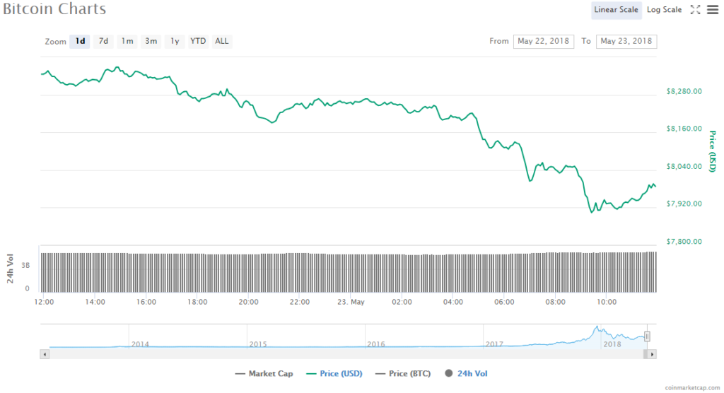 BTC’s price has fallen below the $7K mark in the last 24 hours. The cryptocurrency dropped 3.85% to $7987.86. Trading volume is $5.25 billion and its market value is $135.83 billion.