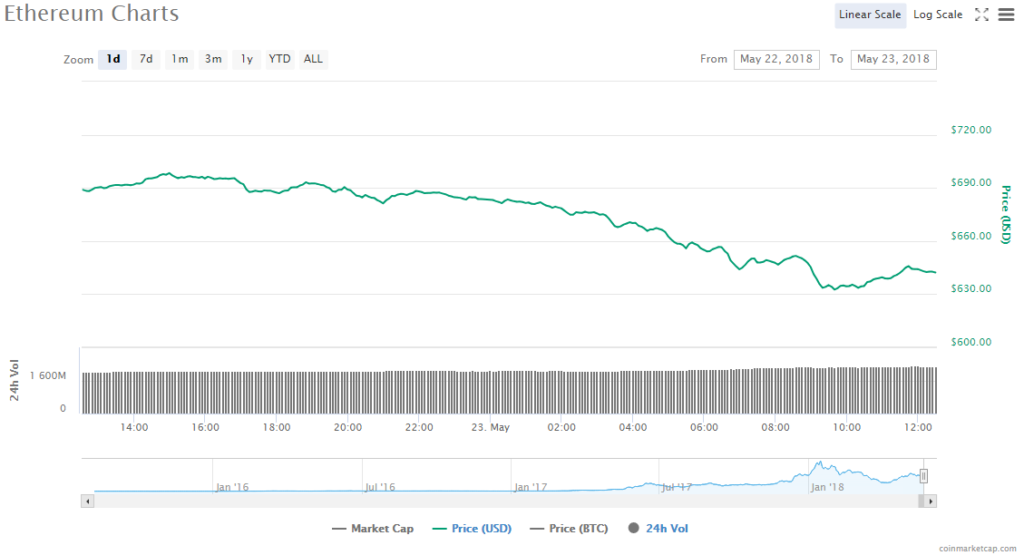 Ethereum’s price fell by 6.94% to $642.23 in the last one day. ETH’s volume in trading is $2.29 billion and its market value is $63.66 billion.