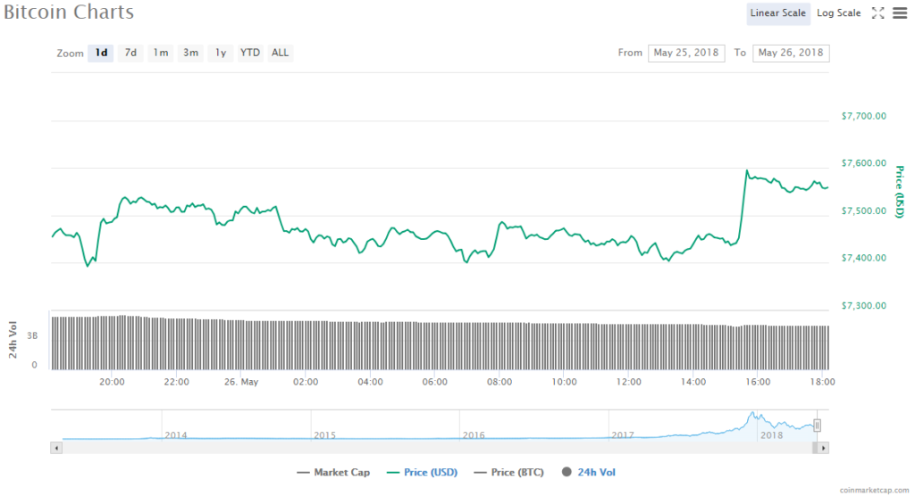 The price of Bitcoin gained 3.1% to trade at $7558.85 in the last 24 hours. The crypto’s trading volume is $4.5 billion and Its value in the market is $128.87 billion.