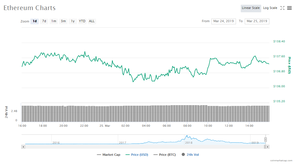 The price of Ethereum is down by a marginal 0.02%, to trade at $137.36 per token. The crypto’s market capitalization is now $14.47 billion and trading volumes are $4.12 billion.