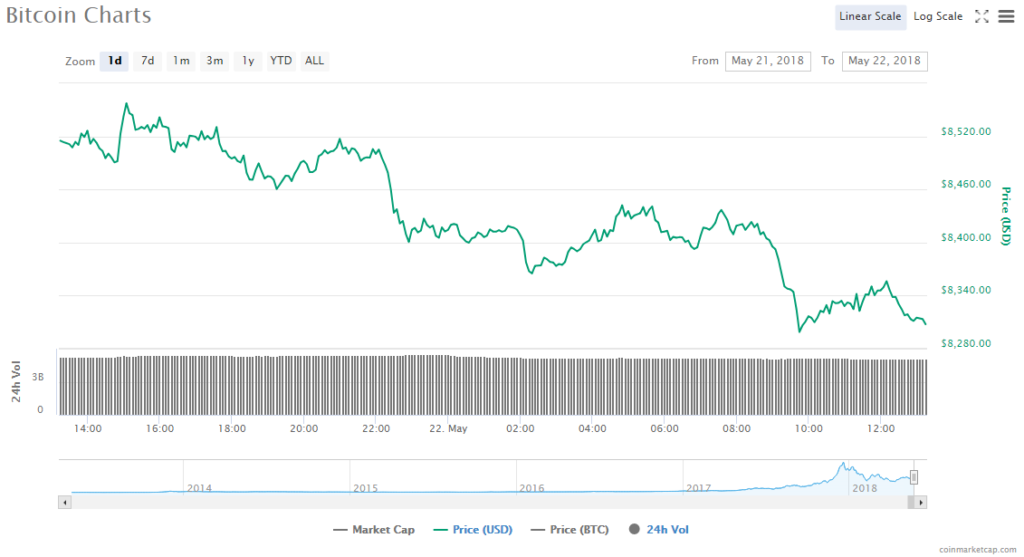 BTC’s price fell once again by 2.30% to trade at $8307.73. Trading volume in BTC is $5.07 billion and its current market cap is $141.80 billion.