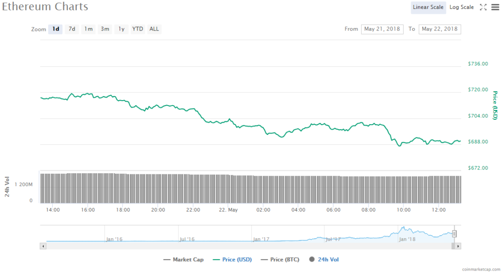 Ethereum’s price dropped by 3.67% to $690.13 since yesterday. ETH’s trading volume is $2.03 billion and its market cap is $68.85 billion.