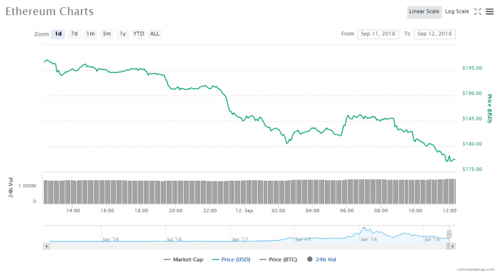 Ethereum’s current price is $177.49, which is a 9.71% drop in the last 24 hours. The digital token’s market valuation is $18.15 billion and its volumes in trading are at $1.60 billion.