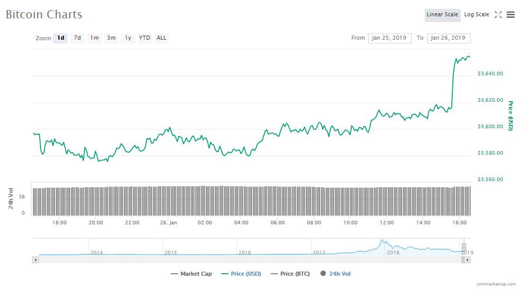 Bitcoin is seeing a second straight day of gains. It is up by 1.66% to trade at $3654.34 per token. The market cap of the token is now $63.95 billion and trade volumes for Bitcoin are now $5.30 billion.
