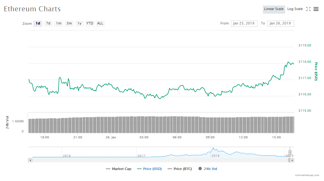 Up by 0.97%, Ethereum is currently trading at a price of $117.94, and has a capitalization in the crypto market of $12.33 billion. The trade volume is now at $2.58 billion.