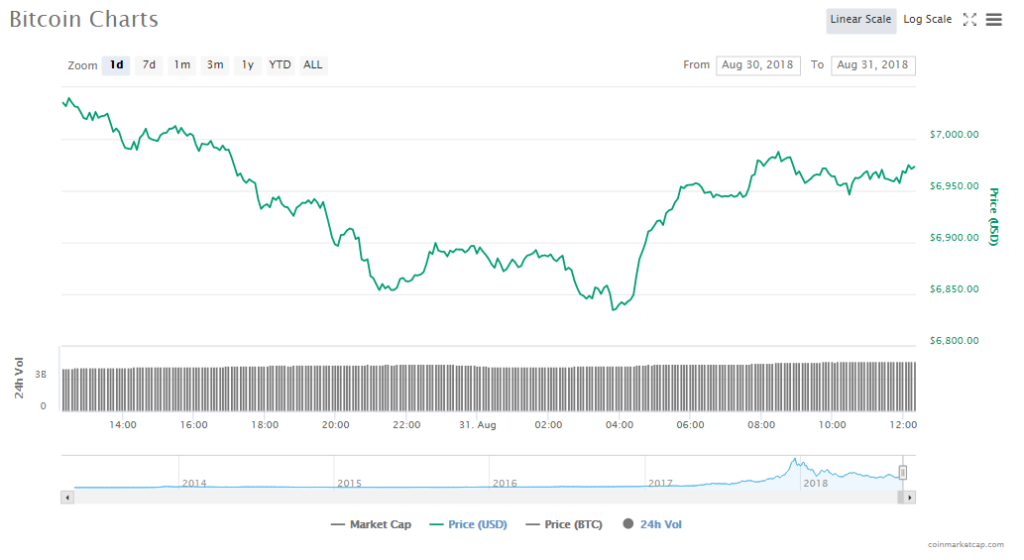 • Bitcoin moved downwards by 0.26% to a price of $6973.20. The asset’s valuation in the market is currently $120.31 billion.