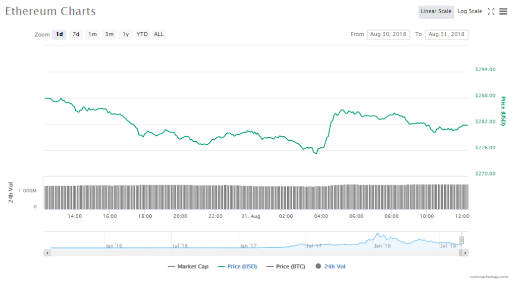 Ethereum’s price is currently at $281.62, a 0.83% drop since yesterday. The altcoin’s valuation is now $28.60 billion and trade volumes are at $1.53 billion.