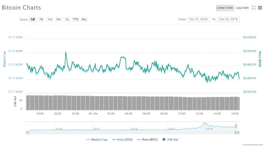 In the past 24 hours, Bitcoin fell 0.23% to trade at $6,461.13. The leading cryptocurrency’s trade volume trickled to $3.14 billion, while its market slid to $112.05 billion.