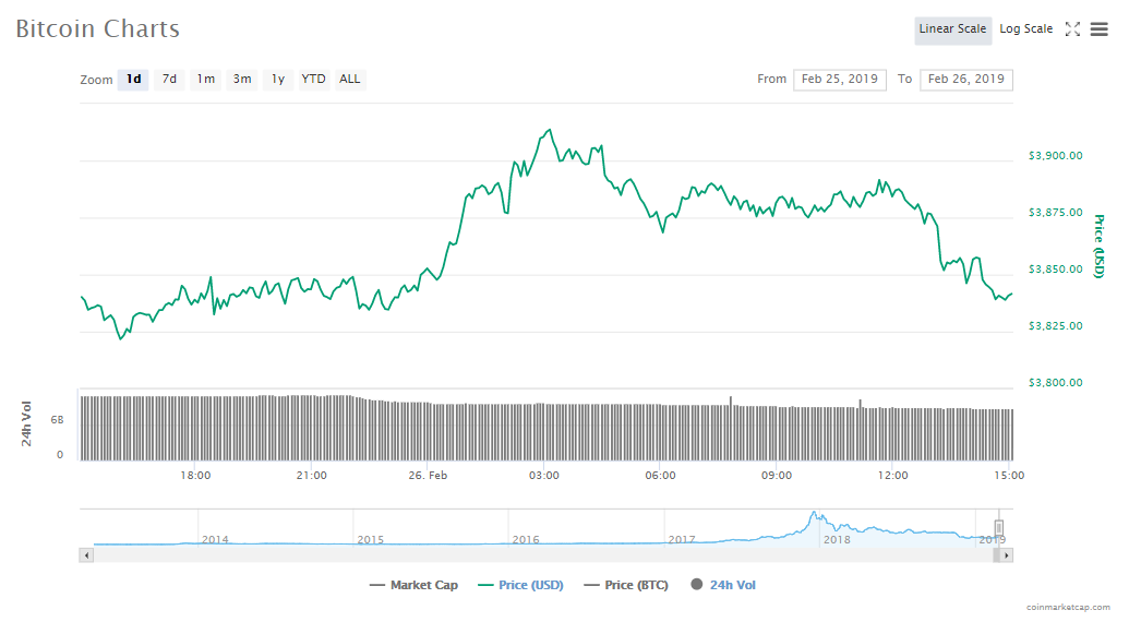 - Bitcoin’s current price is $3841.07, rising 0.10%. The crypto’s worth now is $67.44 billion.