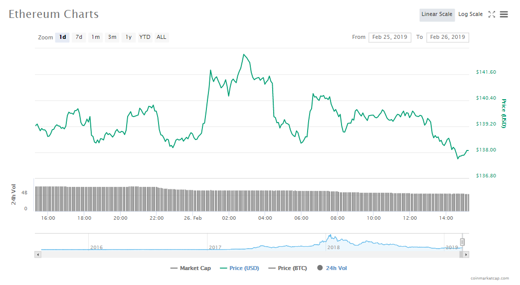 The price of Ethereum has gone down by 1.15% to $137.99 in the last 24 hours. The capitalization of Ether is now at $14.49 billion and trading volumes for the altcoin are at $4.32 billion.
