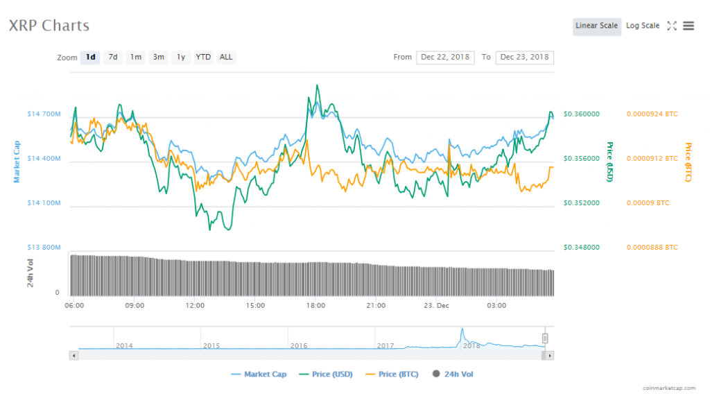 XRP’s price jumped 0.66% to trade at $0.359666. As for the altcoin’s trading volume, it reached $473.59 million; whereas its market capitalization hit $14.67 billion.