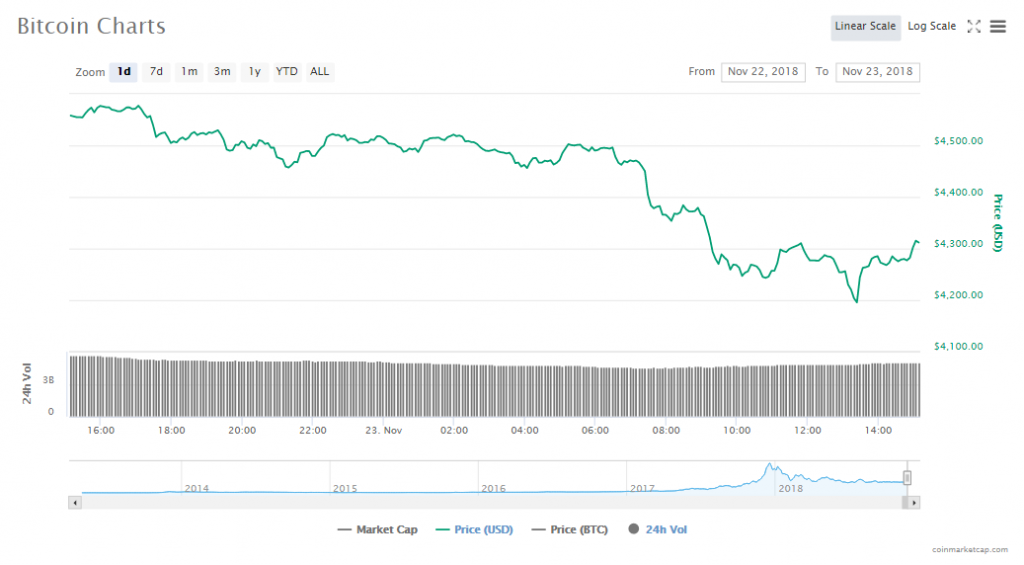 Bitcoin’s price once again dropped, this time by 5.29% to trade at a current price of $4327.66. The digital asset’s worth is now $75.25 billion and trading volumes are now $5.07 billion.