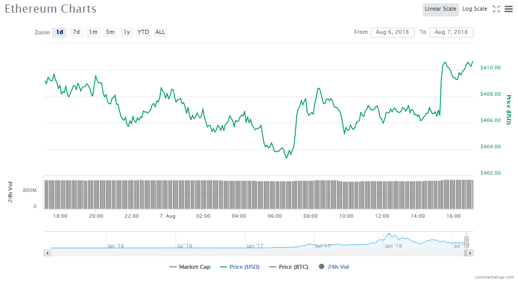 Ethereum gained 0.49% to trade at $410.65. The digital currency’s volume of trading is now $1.43 billion and its value is $41.56 billion.