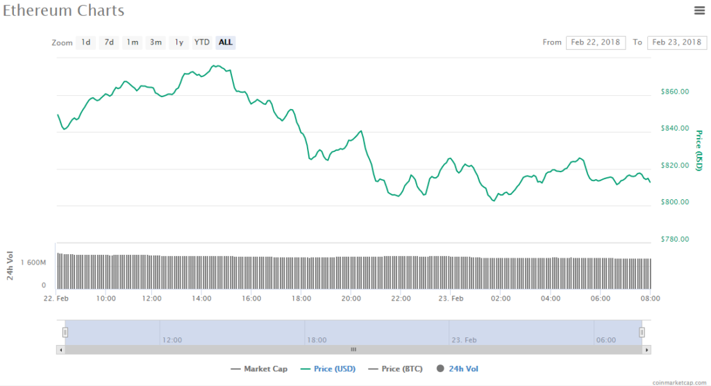 Ethereum’s current price is at $812.85, which represents a loss of 0.40% in the last 24 hours. Trading volume for the altcoin has been at about $2.15 billion in that time period and its market cap is at $79.48 billion.