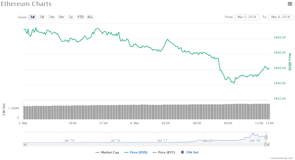Since yesterday, Ethereum has seen a price drop of 2.22% and is currently trading at $848.56. The number two cryptocurrency’s volume in trade has been $1.96 billion and its market cap has reached $83.16 billion.