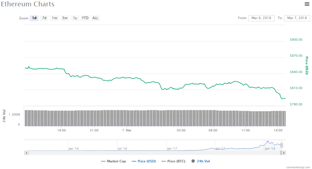 Since yesterday, Ethereum has dropped by 6.43% to its current trading price of $793.96 and has seen a volume of $1.84 billion in trading. The altcoin’s value in the market is currently $77.93 billion.