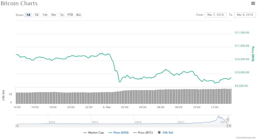 Bitcoin has dropped even further by 7.24% to below the $10,000 market to a price of $9,876.66 in the last 24 hours. The struggling cryptocurrency’s trading volume has been at $9.11 billion in trading. The crypto’s valuation in the market is $166.98 billion.