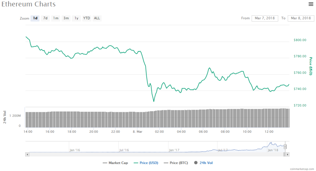 Ethereum has fallen by another 5.69% to a trading price of $748.71 and has a volume of trading of $2.24 billion. The number 2 cryptocurrency has a value of $73.41 billion in the market right now.