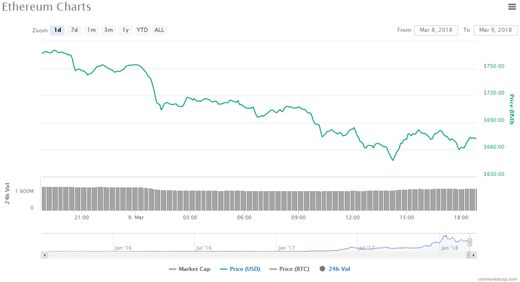 Ethereum has also continued to fall with the rest of the market and is currently trading at $672.20, a big drop of 10.21% in the last 24 hours. Trading volume is at a low of $2.11 billion and the altcoins market value has also dropped to $65.86 billion.