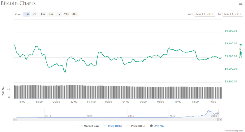 Bitcoin is still struggling to reach the $10,000 market, once again sliding a little to trade at $9,196.64, marking a 2.29% drop. Trading volume has gone down further to 5.85 billion and the Bitcoin’s market cap is currently at $155.81 billion.