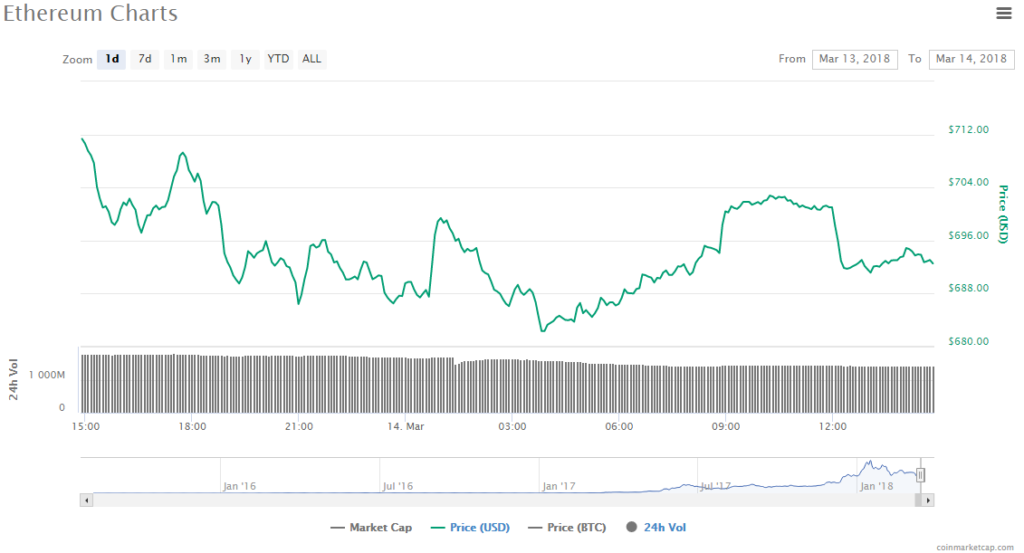 Ethereum’s price continues to fall, and is currently at $692.55, a 2.60% fall from yesterday. The world’s second most valuable cryptocurrency is trading at a volume of $1.1.41 billion. Ethereum’s market cap also dropped slightly to $68.03 billion.