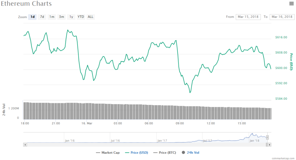 Ethereum has shown a lot of volatility in the last 24 hours, with the altcoin’s price see-sawing up and down. Currently, at the time of writing, Ethereum’s price is up by 2% in the last one day to currently trade at $600.35. The world’s second most valuable cryptocurrency has a trade volume of $1.45 billion and its market capitalization is $58.95 billion.