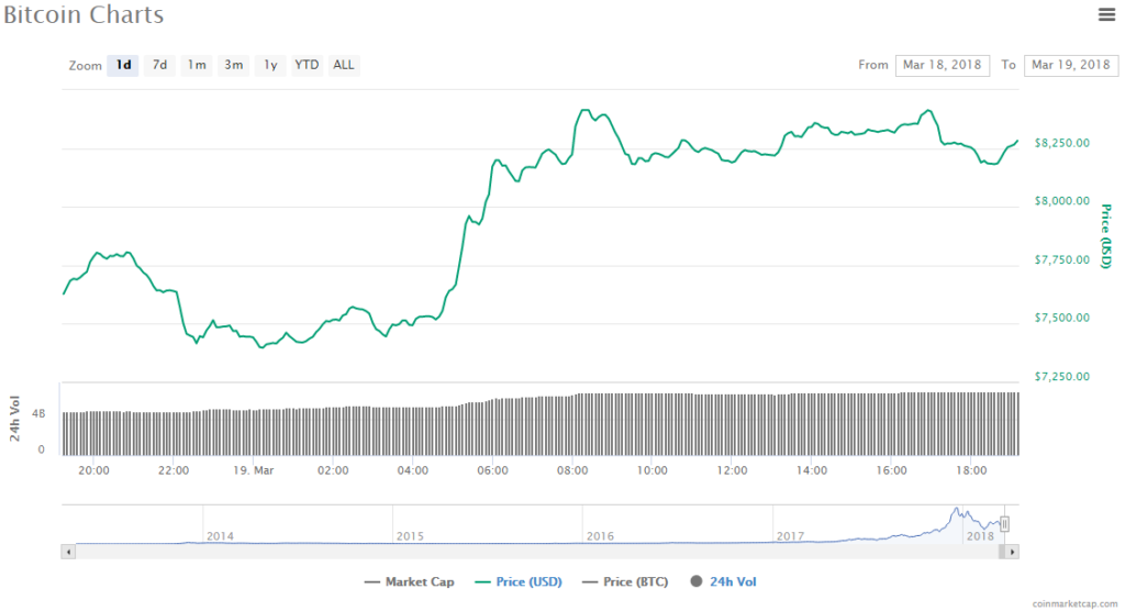 Bitcoin has finally started the week on a better note, with the cryptocurrency gaining by 6.48% to currently trade at $8282.63. Additionally, trading volume has almost doubled to $7.04 and Bitcoin’s market cap has gone up to $140.50 billion.