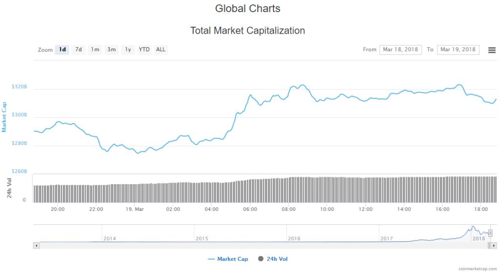 So far, the last 24 hours have shown an improvement in the cryptocurrency market’s numbers. Trading volume finally saw an upswing, with the figure going up to 18.59 billion. Market capitalization for the cryptocurrency industry also went up to $315.67 billion.