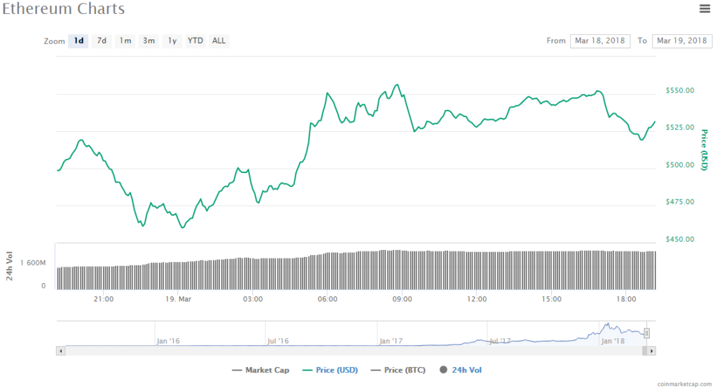 • Ethereum’s trading price is right now $531.41, rising up 3.26%. The market value of Ethereum is now $52.41 billion.