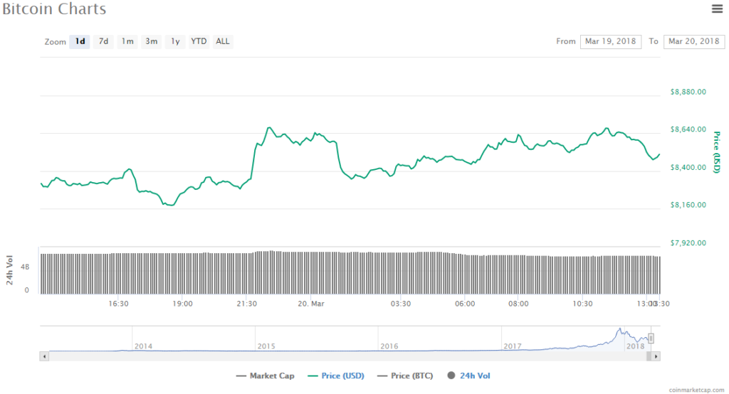 Bitcoin is still rising for the second day in a row with a gain of 2.69% to a current trading price of $8505.88. Trading volume has slipped slightly to $6.50 billion and Bitcoin’s market value has gone up to $144.15 billion.