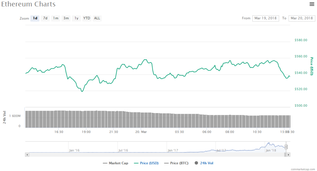 Ethereum’s price also increased slightly, gaining by 1.17% to $537.64. Market value for the crypto is now $53.05 billion and trading volume is $1.97 billion.