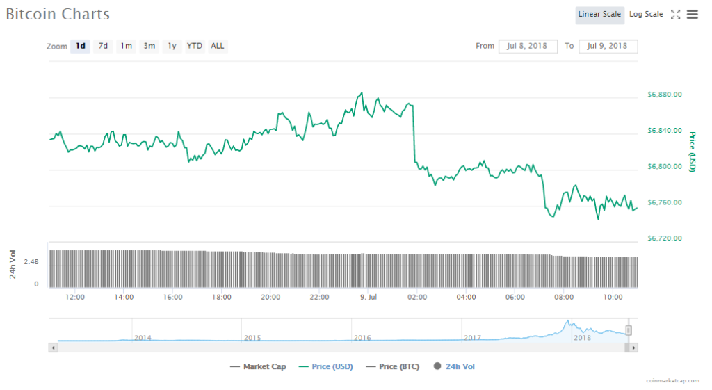 Bitcoin’s price dropped by 1.11% since yesterday to $6757.66 per token.