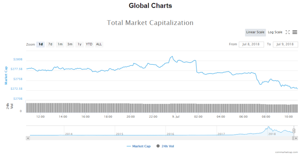 After a weekend of gains, the cryptocurrency market is showing a slight drop in performance in trading so far this Monday. The volume of trading in the cryptocurrency market has dropped to $10.75 billion and the capitalization of the segment is now up at $273.13 billion.