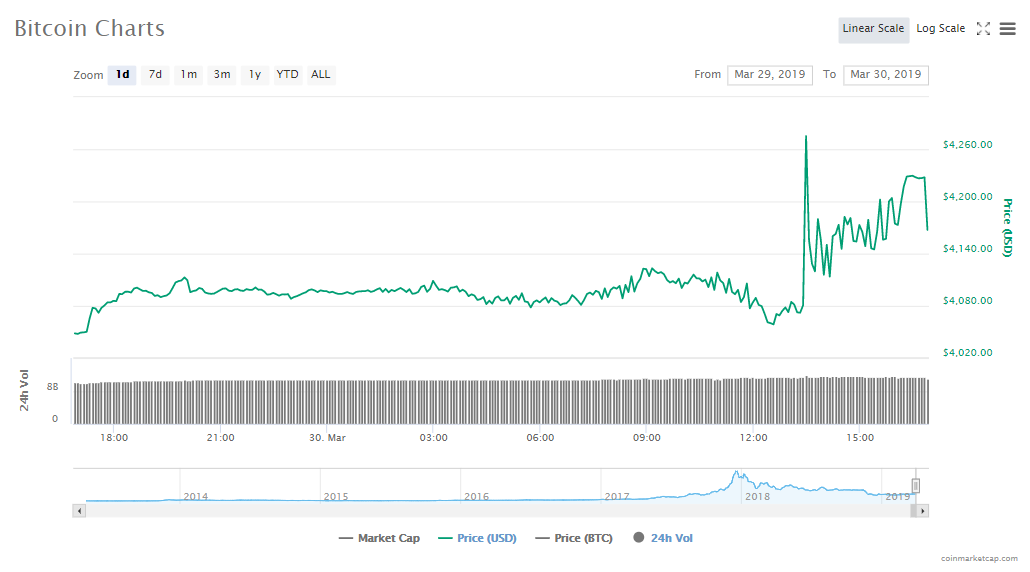 - Bitcoin’s trading at $4098.85, increasing 0.98%. The crypto-asset’s market cap is now $72.21 billion.