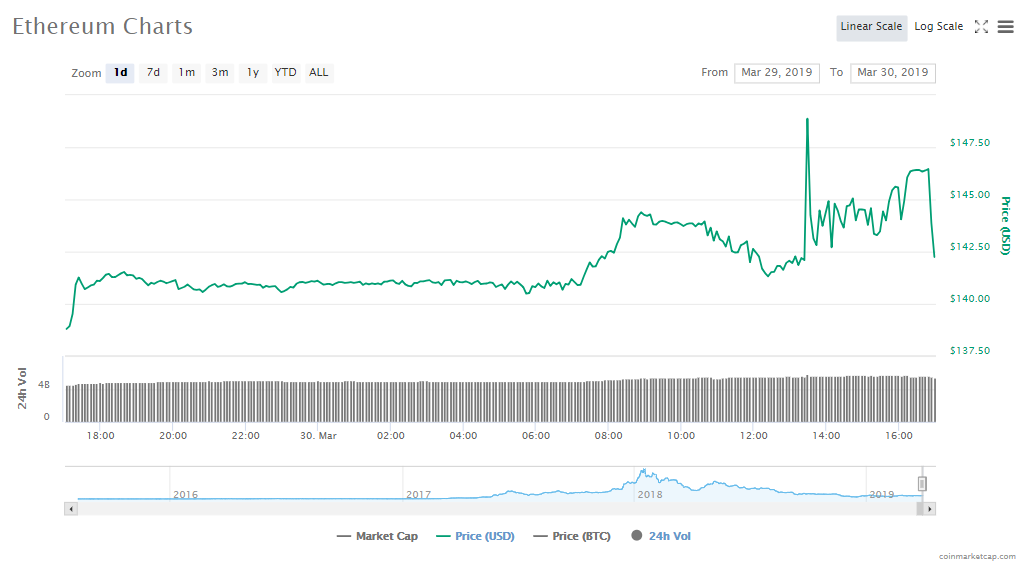 - Ethereum’s trading at $142.05, increasing 1.62%. The crypto-asset’s market cap is now $14.97 billion.
