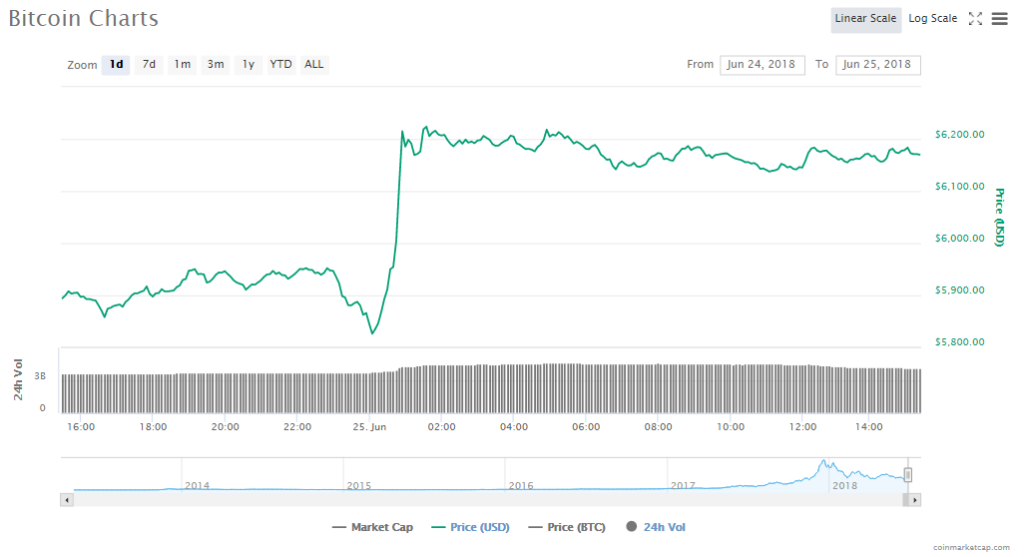 In the last 24 hours, the price of Bitcoin jumped up 4.67% to $6170.02. Trading volume in BTC is $4.1 billion and BTC’s market capitalization was at $105.59 billion.
